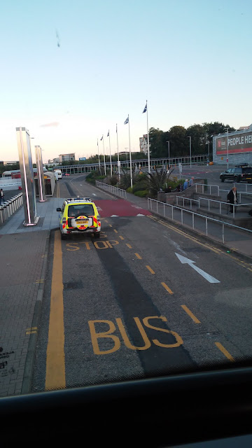 On the bus. They sent 2 to pick us up. Right on time. Except someone forgot to inform the guy driving the stairs-car, so we had to wait 5 minutes until it arrived :D Still, it was a real smooth, and a pleasant experience flying with the British Airways. Really liked the communication with the passengers too from the captain.